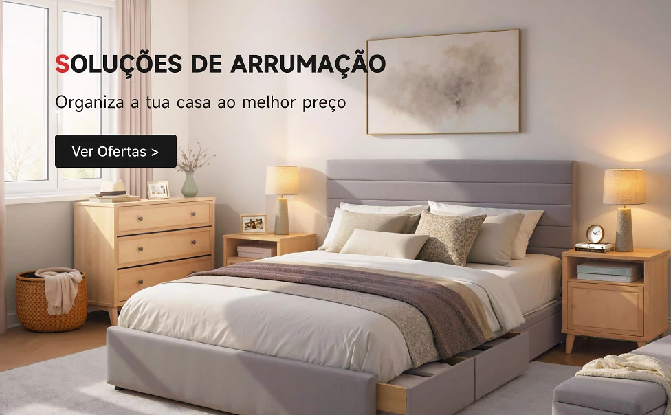 Este quarto mostra como pode desfrutar do conforto sem abdicar da arrumação. A cama com espaço de arrumação integrado permite guardar roupa de cama e outros artigos do dia a dia. A cómoda aumenta a capacidade de organização, mantendo tudo acessível e fora da vista, enquanto o banco de arrumação oferece um apoio extra e mais espaço funcional no quarto