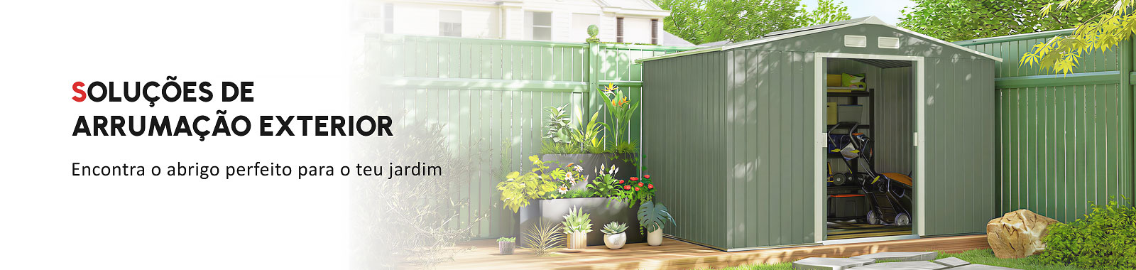 A sua estrutura em aço galvanizado é resistente à água e ao sol, ideal para guardar acessórios de jardim.