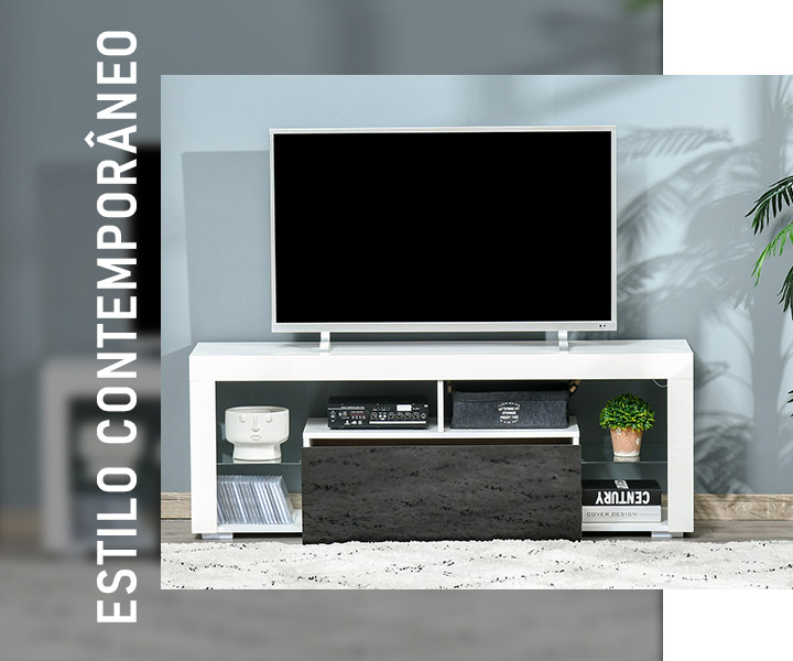 HOMCOM Móvel de TV para Sala de Estar com Iluminação LED 6 Modos de Cores Controle Remoto Gaveta e Prateleiras de Cristal Ajustáveis 140x35x52cm Preto e Branco Brilhante