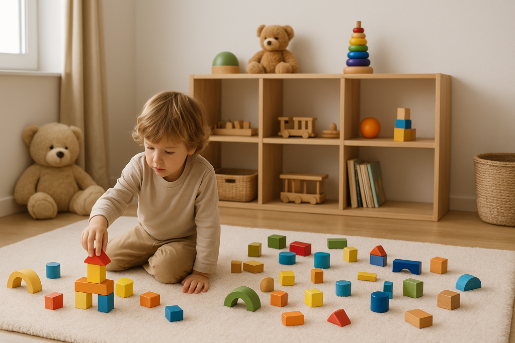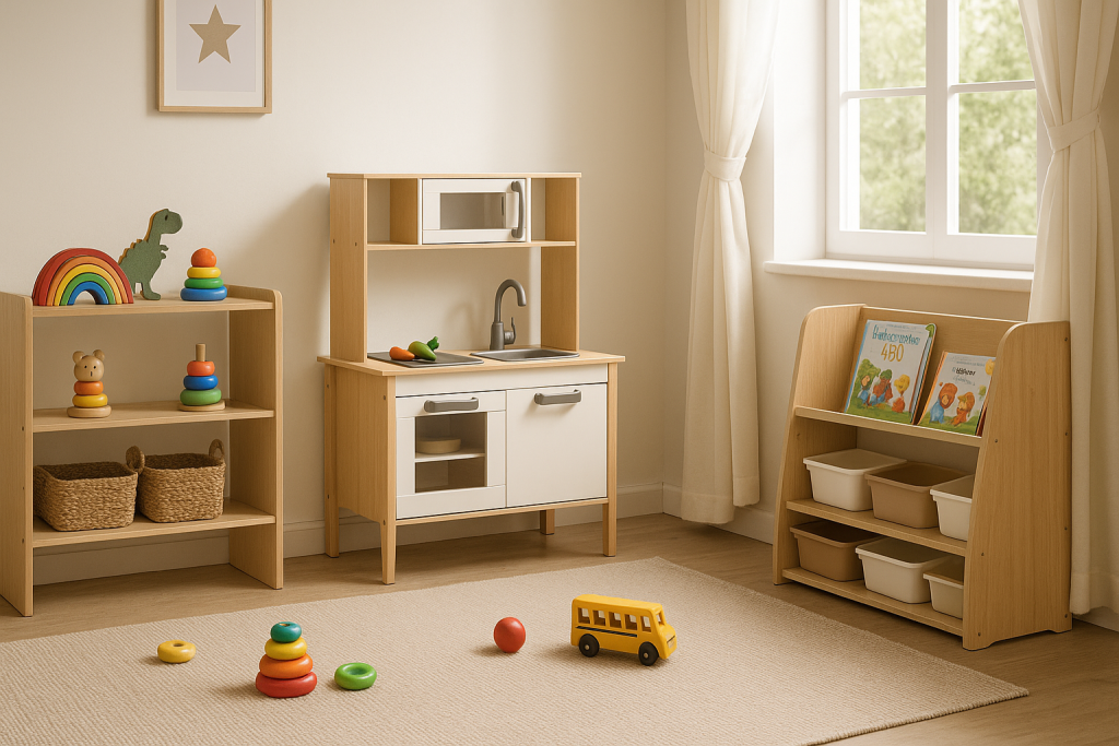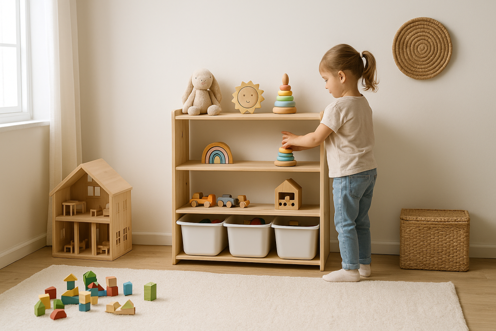 - Brinquedos acessíveis: organizados em prateleiras baixas ou caixas visualmente arrumadas.