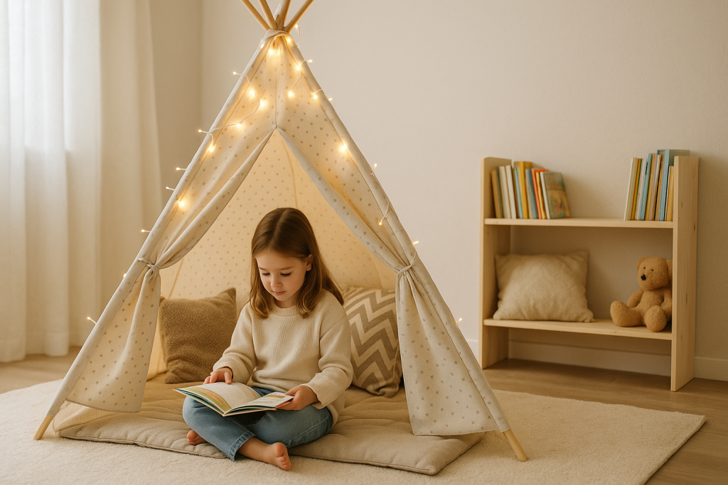 Este espaço favorece a leitura precoce, a autorregulação e o descanso emocional. Ajuda-os a encontrar tranquilidade após um dia cheio de estímulos e a conectar consigo próprios.