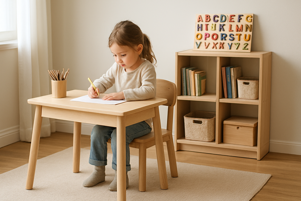 Cantinho de estudo simples, primeiros organizadores de secretária, jogos de construção mais complexos.