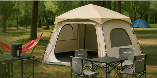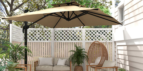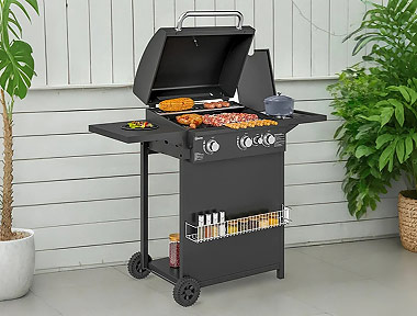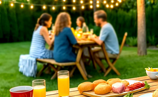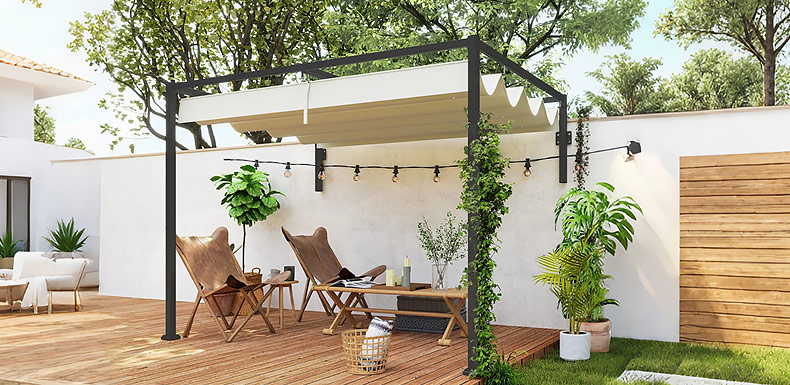 Aproveitar o ar livre nunca foi tão simples. Este espaço combina uma pérgola de jardim com um conjunto de mesa e cadeiras, criando uma zona prática para refeições. O barbecue e o carrinho auxiliar ajudam na preparação, enquanto a iluminação permite prolongar os momentos ao ar livre até ao final do dia