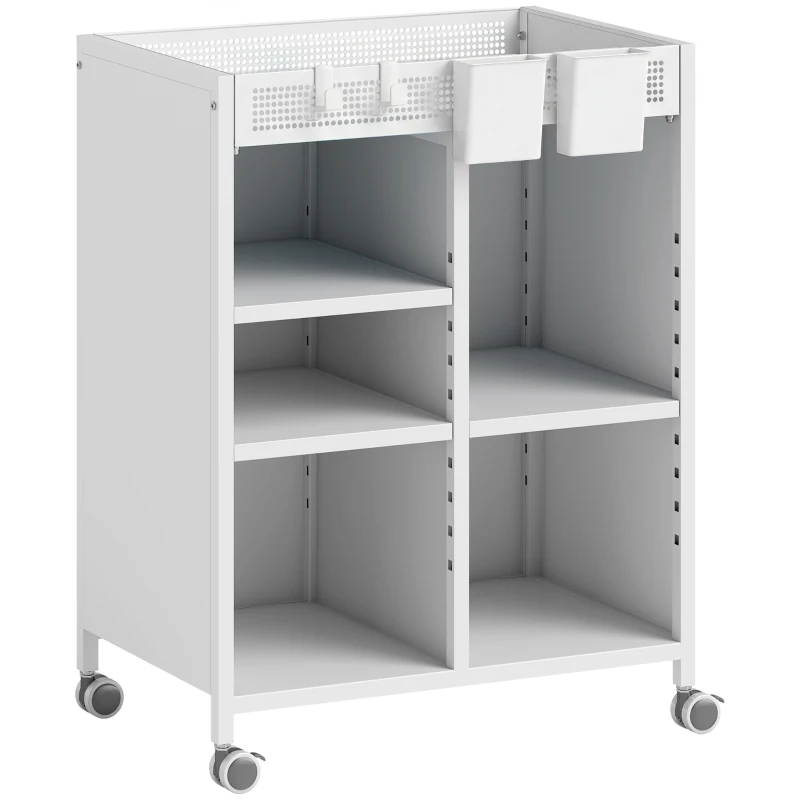 HOMCOM Estante com Rodas 4 Níveis Prateleiras Ajustáveis Cestos Suspensos para Escritório em Casa e Sala de Estar Branco