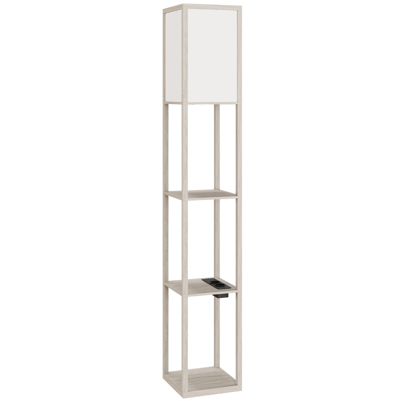 HOMCOM Lâmpada de Chão com Prateleiras, Luz Ajustável, Interruptor de Pé e Portas USB, Branco e Rovere