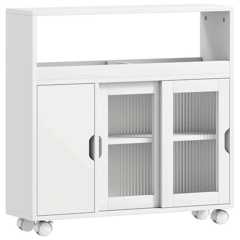 HOMCOM Móvel de Casa de Banho com Rodas Prateleira Regulável Porta Deslizante em Vidro Temperado Branco