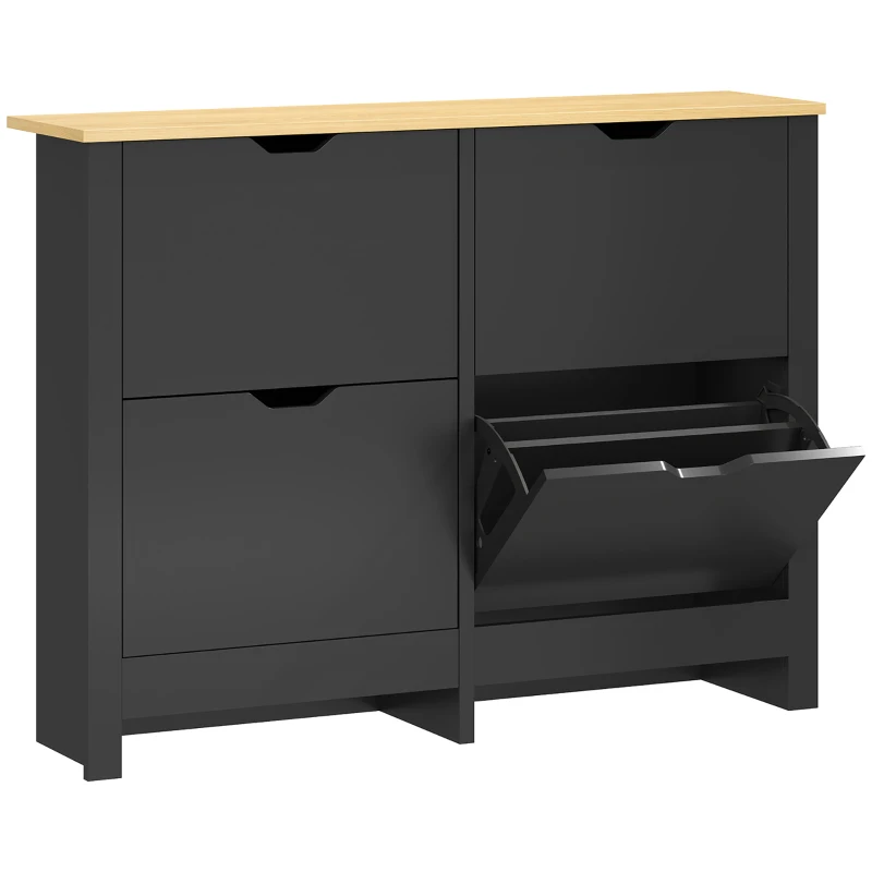 HOMCOM Móvel para 16 pares de sapatos, armário com 4 gavetas basculantes e prateleiras ajustáveis, preto e madeira natural