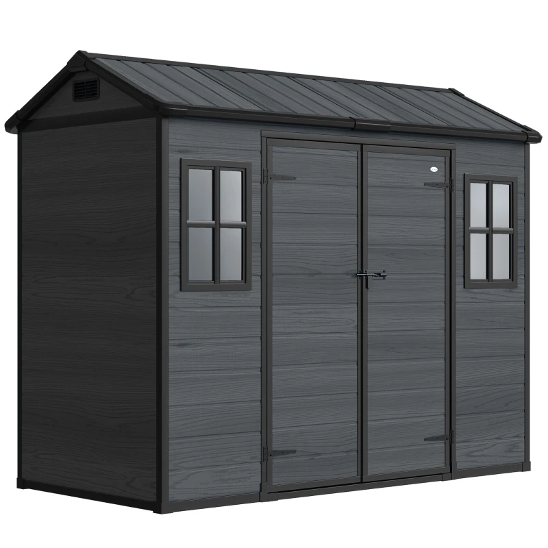 Outsunny Abrigo de Jardim Exterior 2,77 m² 244x131x201 cm com Base, Portas com Fecho, Janelas e Ventilação, Cinzento Escuro