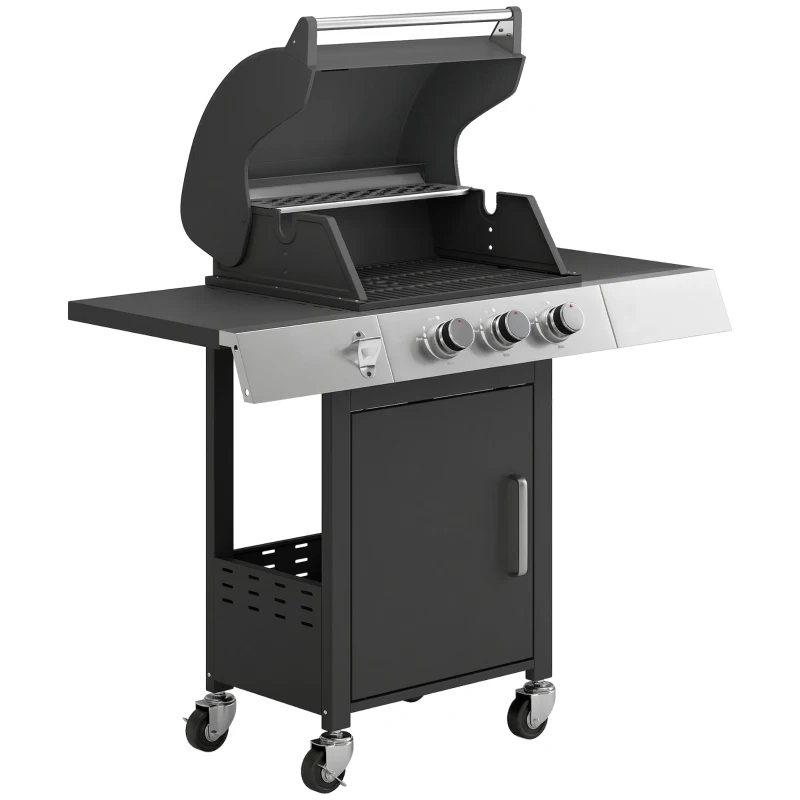 Outsunny Barbecue a Gás com 3 Queimadores 8,1 kW Termómetro Grelhas Mesas Laterais Armário e Rodas 109x50x109 cm Preto