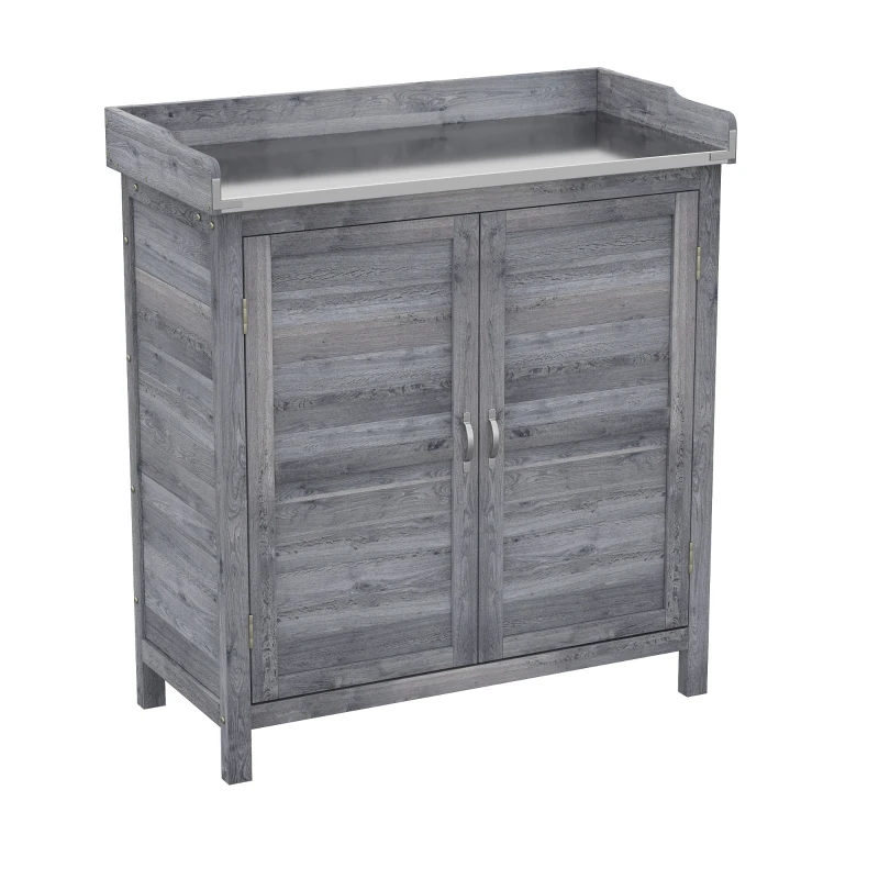 Outsunny Mesa de plantio com armário inferior em madeira, armário de jardim exterior com tampo galvanizado, 2 prateleiras Cinza