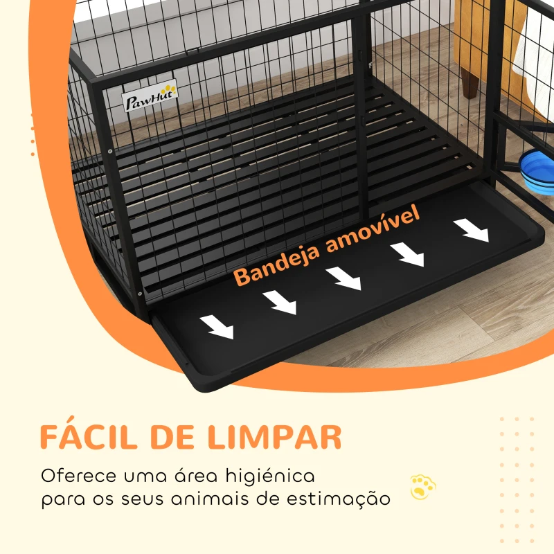 PawHut Gaiola para Cães com Parte Superior Rebatível Suporte de Tigelas Bandeja Amovível Rodas e Porta Dupla 109x72x79 cm Preto
